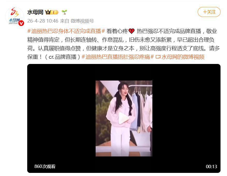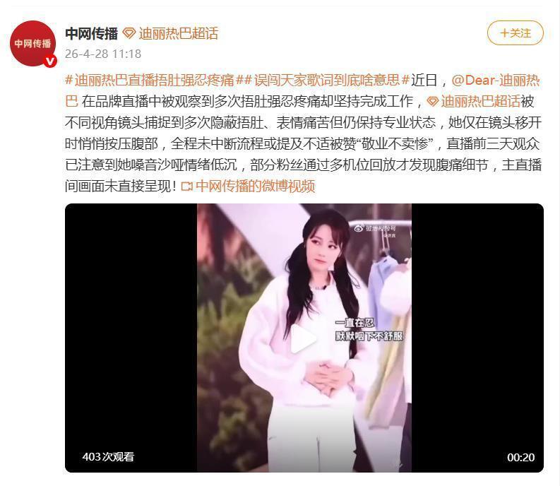 据 4 月 28 日报道,近日,迪丽热巴在某品牌直播活动中,被多机位镜头捕捉到多次隐蔽捂腹、表情痛苦的画面。据现场细节显示,她仅在镜头移开时悄悄按压腹部,全程未中断流程或提及任何不适,主直播间画面甚至没有直接呈现这些疼痛细节。直到部分粉丝通过多机位回放反复查看,才发现她当时的状态远非“正常”二字可以概括。